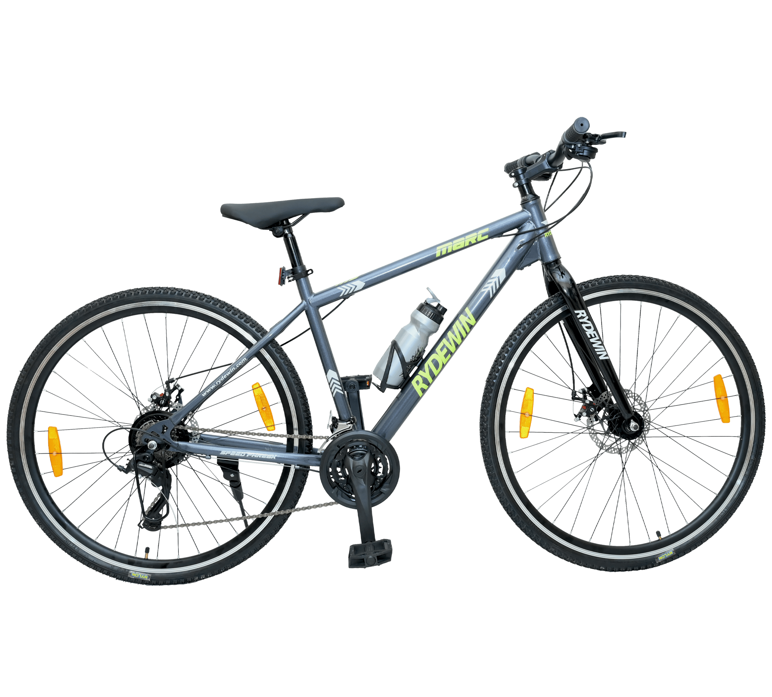 The RYDEWIN MARC 735C Hybrid Bike is a versatile 21-speed city and hybrid bike designed for both commuting and recreational riding. Featuring a lightweight frame, it offers effortless handling and easy maneuverability. The bike is equipped with a Shimano geared system for smooth shifting, while the double disc brakes provide reliable stopping power in various conditions. With 85% of the bike pre-installed, it's easy to set up and ready for your next adventure. Its simplistic design ensures a sleek and modern look, making it an excellent choice for urban riders seeking style and functionality.