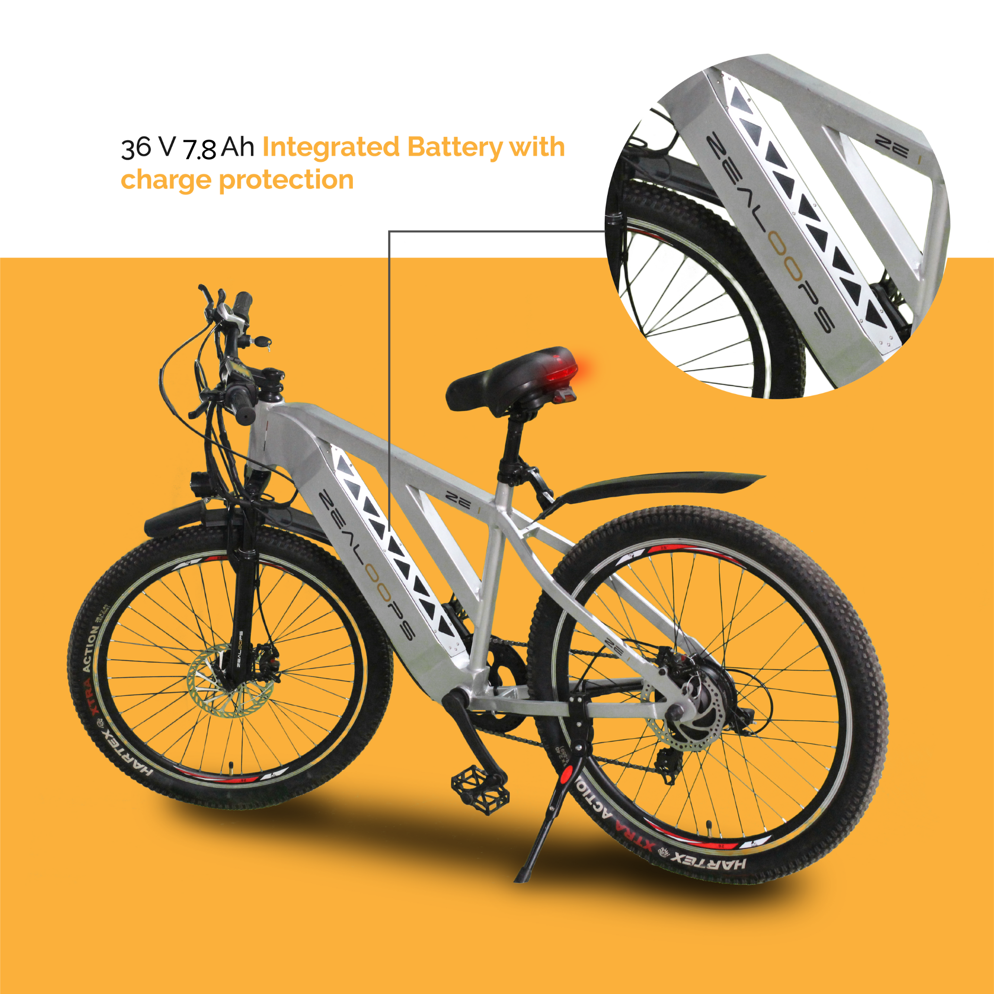 - Battery: 36V 7.8Ah internal battery for extended range of upto 60 KMS on Single Charge.